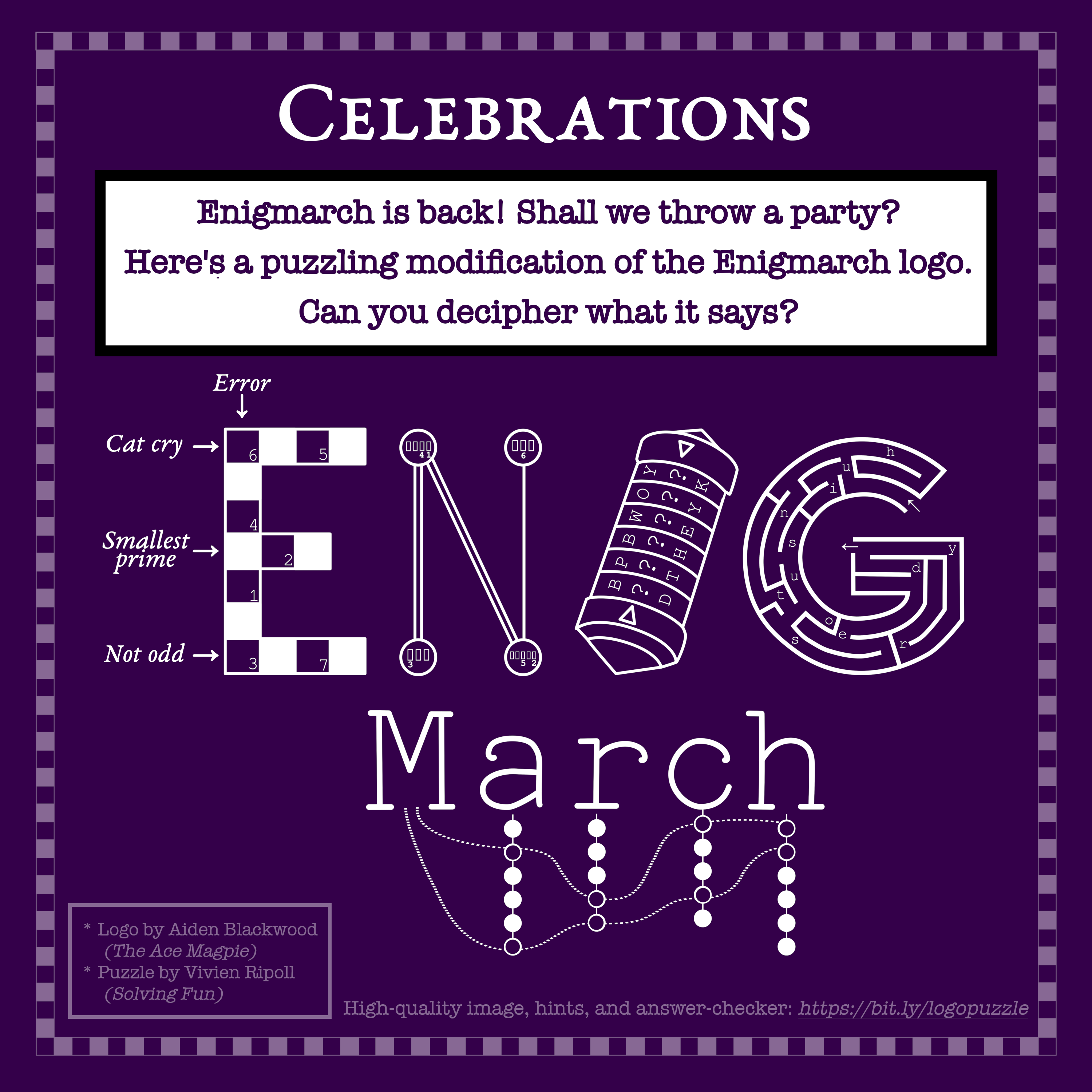 Before the beginning of March, I was inspired by the very cool logo of Enigmarch (designed by Aiden Blackwood, aka The Ace Magpie) to make a new puzzle. My way of celebrating Enigmarch while warming up my puzzle design muscles! Hints and answer-checker below.
