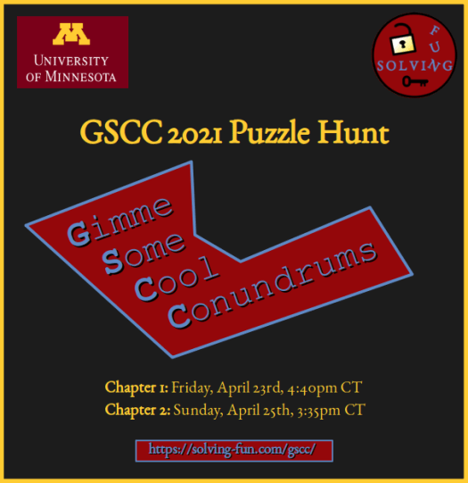 Solving Fun has created an online Puzzle Hunt for the conference GSCC 2021 (Graduate Students Combinatorics Conference, hosted by the University of Minnesota Twin Cities). The puzzles may include references to GSCC, to combinatorics and to math in general. There are two chapters, to be played during the opening reception on April 23rd and the closing reception on April 25th (see schedule).