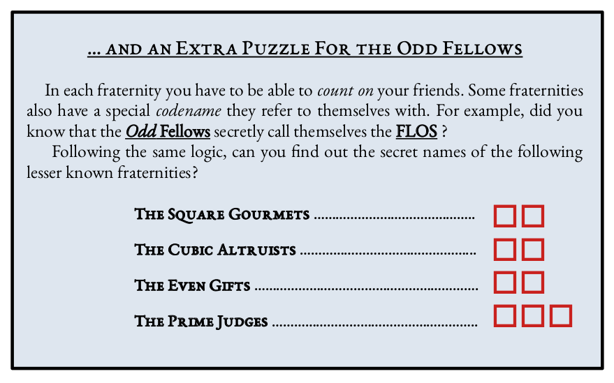 Here is an extra puzzle I made for the Odd Fellows (ask for hints if needed). Scroll down for more puzzles!