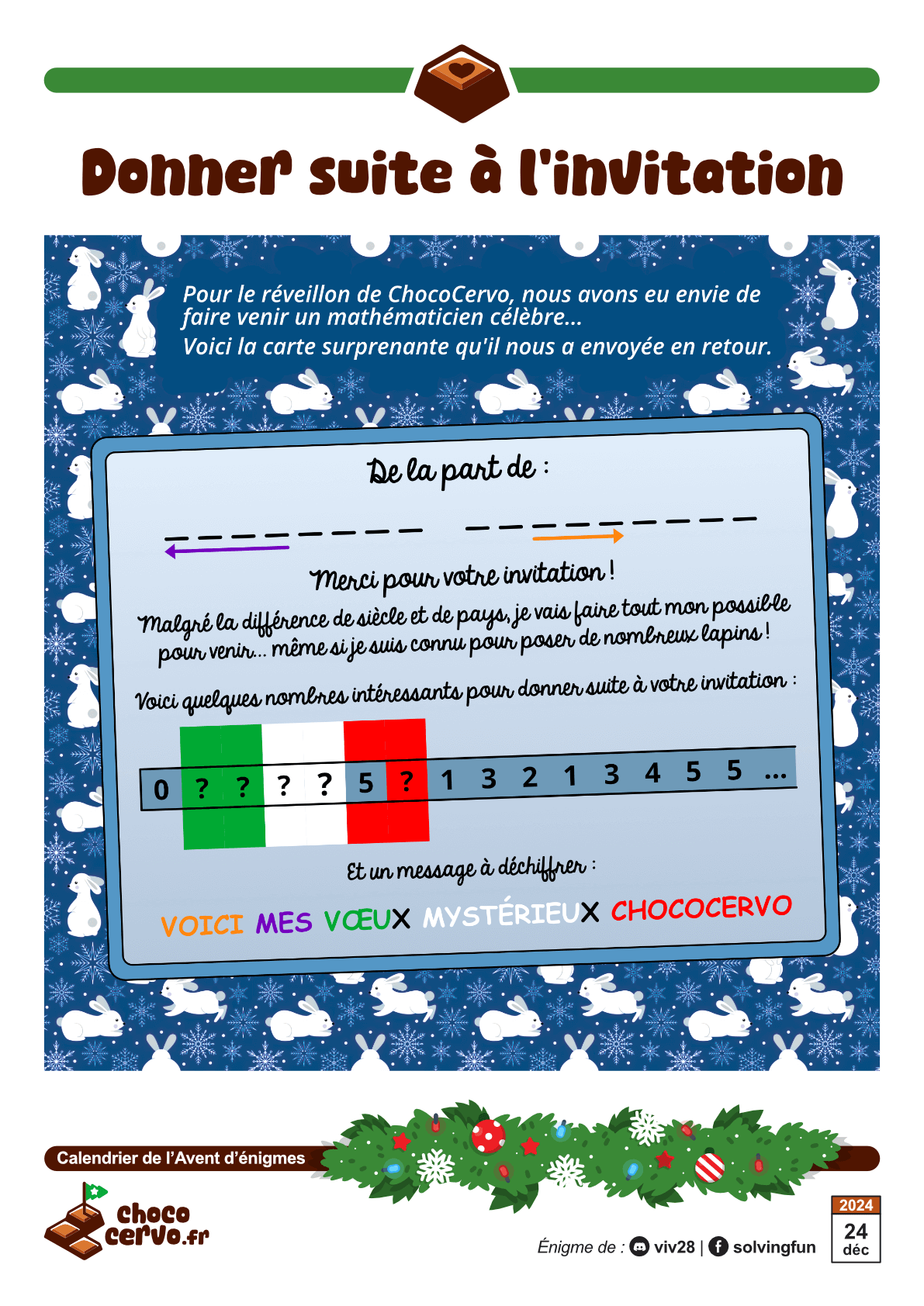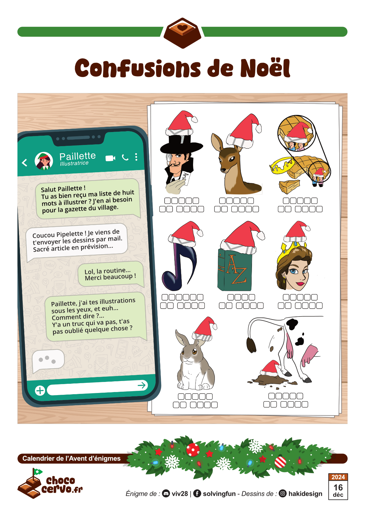 Comme en 2022 et 2023, j’ai créé cette année deux nouvelles énigmes de Noël pour le calendrier de l’Avent ChocoCervo 2024 : Confusions de Noël, et Donner suite à l’invitation.