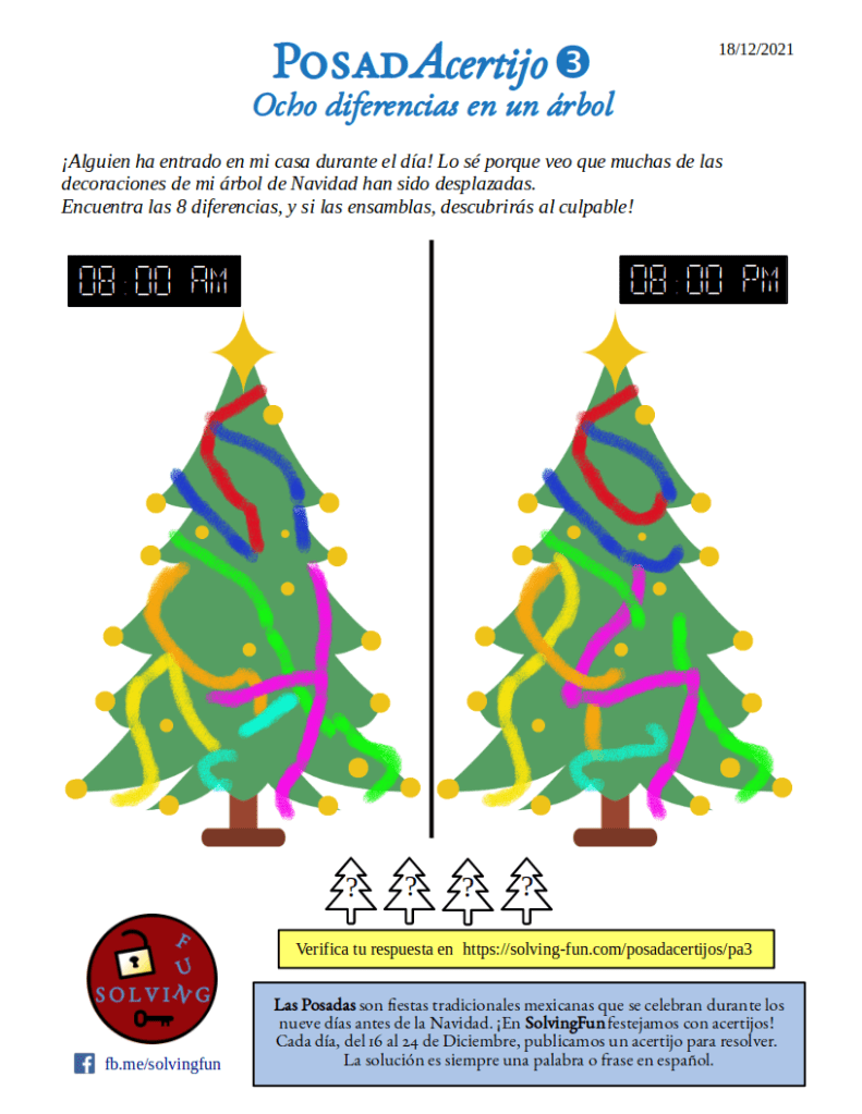 Sábado 18 de diciembre 2021: PosadAcertijo 3 Haz clic para descargar el pdf. Verifica tu respuesta y regístrate en el marcador con el siguiente formulario: Like Loading...