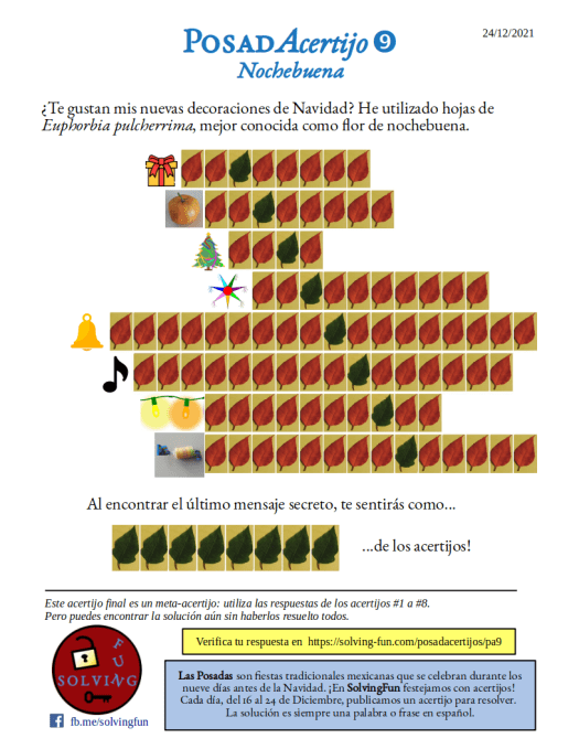 Viernes 24 de diciembre 2021: PosadAcertijo 9 Haz clic para descargar el pdf. Verifica tu respuesta y regístrate en el marcador con el siguiente formulario: Like Loading...